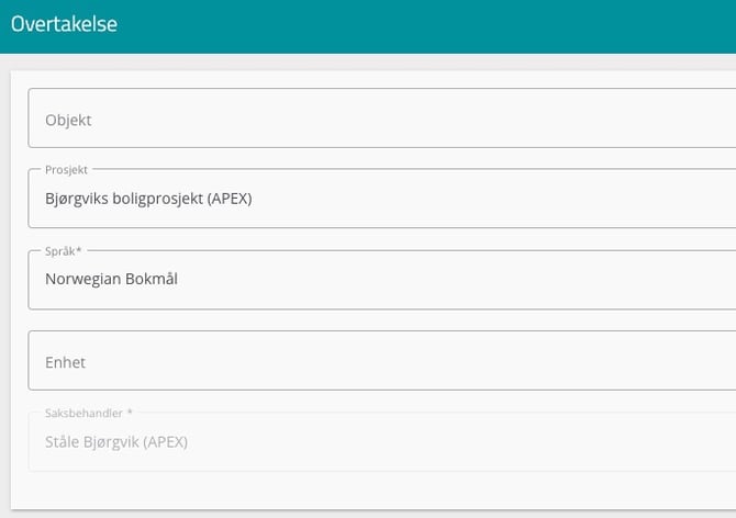 - Hvis det er satt en standard saksbehandler på prosjektet, så vil personen automatisk bli satt. Ellers kan du velge saksbehandler selv. Er ingen av disse gjeldende, blir den som går overtakelsen satt som saksbehandler.