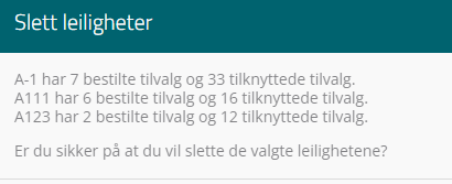 Dette er en funksjon som IKKE KAN REVERSERES! Hvis man velger å slette bolig(er) fra prosjektet, så blir disse, og tilknyttet data, permanent fjernet fra prosjektet.